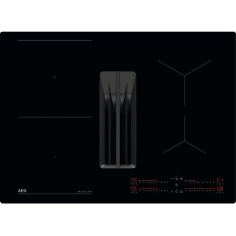 Placa de indução de 68 cm com exaustor integrado da Série 6000 Bridge AEG, função Bridge, controlos deslizantes individuais (0-9 com função Power) com temporizador Eco individual, exaustor com 3 velocidades + 1 intensivo e modo Auto, (650 m³ /h), filtro de carbono ativo e gordura com indicador de saturação, instalação em modo de recirculação com opção de modo de extração para o exterior com acessórios adicionais.