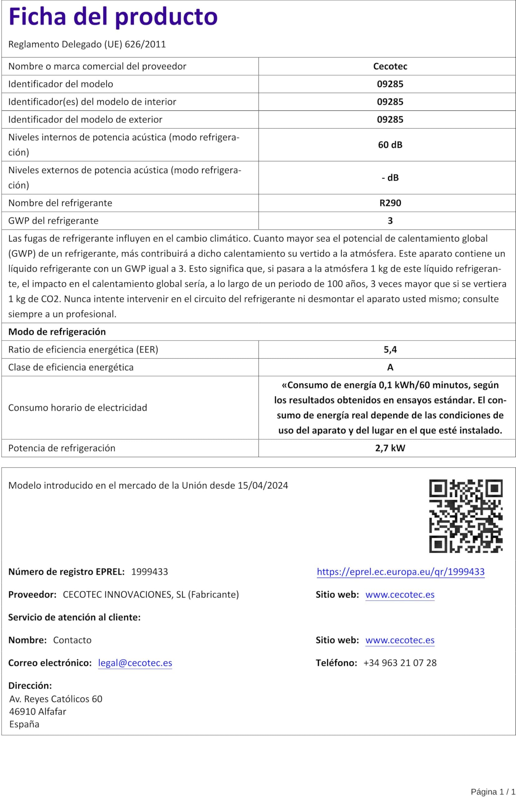 Especificações Cecotec WindowClima 9000 Inverter