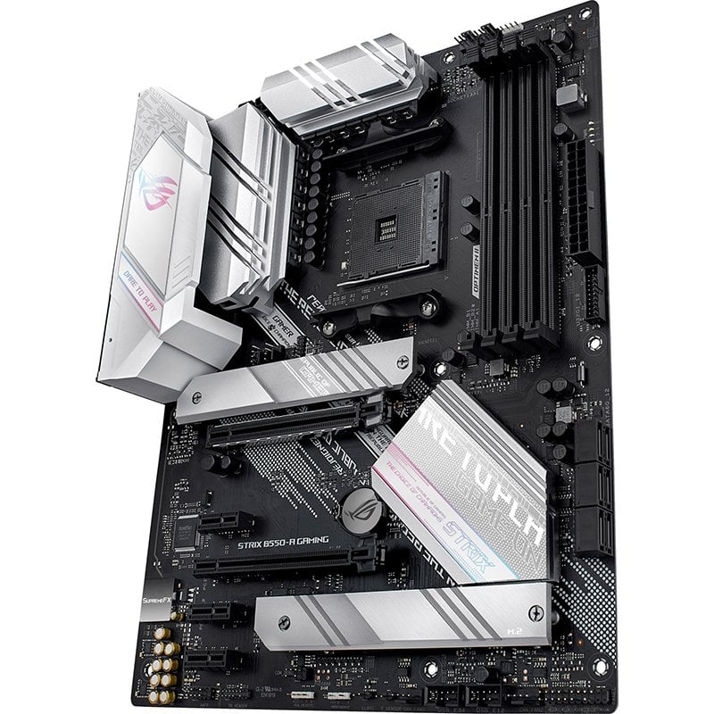 Oferecendo um fornecimento robusto de energia e um arrefecimento eficaz, a Asus ROG Strix B550-A Gaming está bem equipado para lidar com CPUs AMD de terceira geração Ryzen?. Como um bónus adicional, o desempenho excepcional é complementado por um acabamento branco e prateado marcante e uma estética inspirada no ciberpunk que parece excepcional.