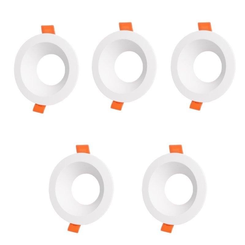 Instalação rápida e segura. O pack de 5 aros permite a montagem eficiente de lâmpadas GU10 ou MR16 em tetos falsos e painéis técnicos, garantindo integração estética e funcional em ambientes comerciais e domésticos.