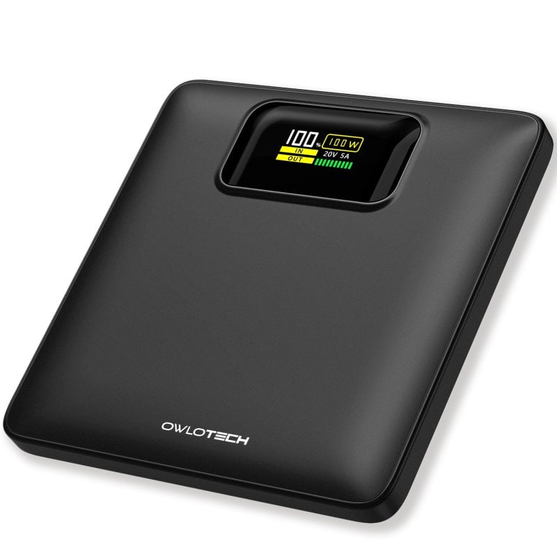 Bateria externa Owlotech Kireon 100W 20000mAh com carregamento rápido USB-C para portáteis, preta.
