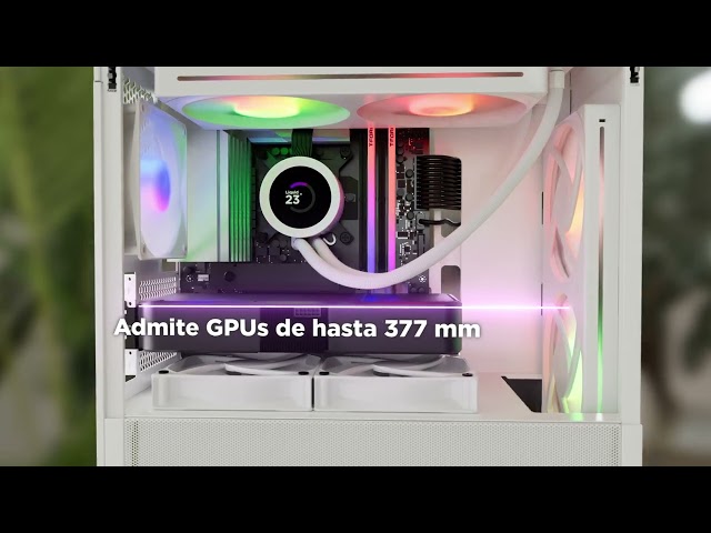 Desempenho térmico excecional. A sua estrutura Midi Tower apresenta um design frontal em malha e inclui uma ventoinha traseira de 120 mm pré-instalada, facilitando o arrefecimento eficiente mesmo em configurações com GPUs exigentes e refrigeração líquida. Compatível com radiadores até 280 mm na frente e 240 mm na parte superior, permite sistemas de alto desempenho sem estrangulamentos térmicos.