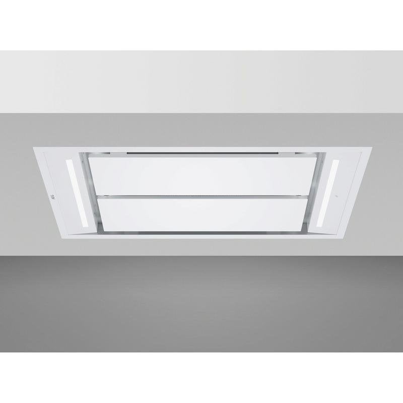 O design discreet embutido no teto, em branco, conjuga-se com materiais duráveis como o aço inoxidável e alumínio, garantindo robustez, fácil limpeza e integração estética. Ideal para quem procura manter a cozinha livre de cheiros, humidade e partículas.