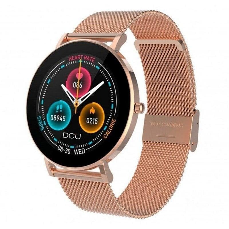 O DCU Boulevard distingue-se pelo seu corpo elegante em liga de zinco com acabamento em ouro rosa e bracelete metálica, aliados a um ecrã AMOLED tátil de 1,3" protegido por Gorilla Glass, proporcionando nitidez, fluidez e modo Always-On para uma experiência visual avançada. Pensado para entusiastas de tecnologia e de bem-estar ativo, integra 14 modos desportivos (caminhada, corrida, natação, yoga, golfe, entre outros) e permite rastreamento detalhado de passos, calorias, distâncias e desempenho diário.