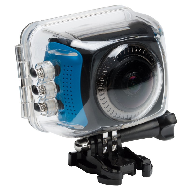 Cámara compacta de acción de foto y vídeo con gran angular 220°, pantalla LCD 1,5” y resolución full HD. Incluye carcasa protectora resistente a caídas y sumergible hasta 30m. Incluye adaptador de casco, carcasa sumergible, soporte para bicicleta, adaptador para trípode, accesorios de montaje, Cable USB.