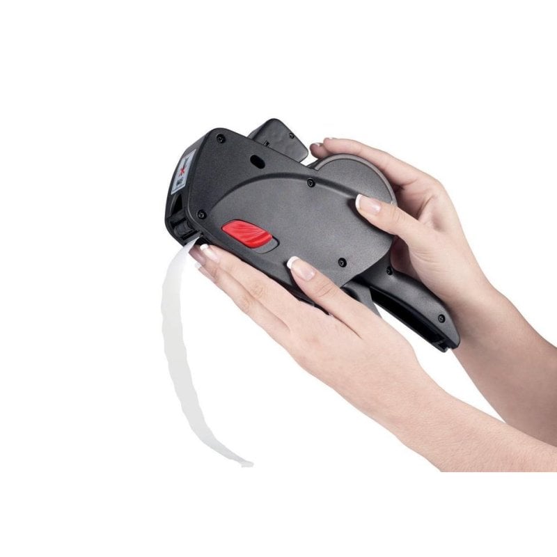 Como utilizá-la? Posicione a etiquetadora no suporte, alinhe-a e pressione para aplicar a etiqueta. A sua conceção ergonómica facilita uma apreensão rápida e uma utilização intuitiva.