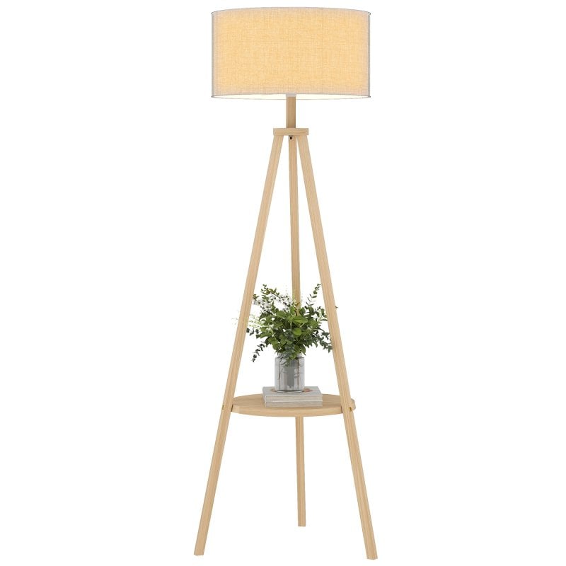 Homcom Candeeiro De Pé Tripé Com Prateleira Estrutura De Madeira e Ecrã Cinzento