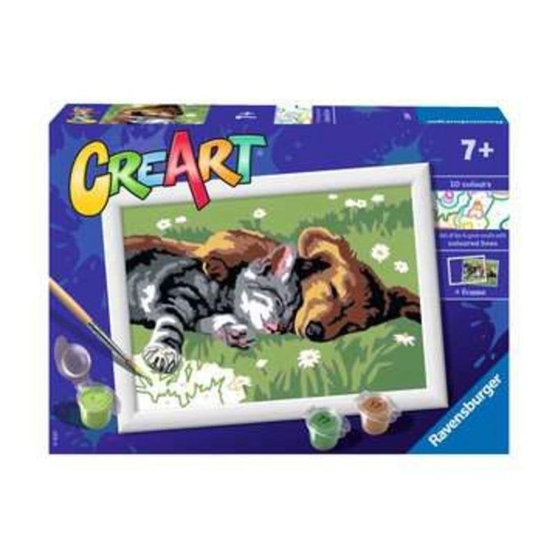 Desperte a criatividade das crianças com o Kit de Pintura por Números Ravensburger CreArt Sleeping Cats and Dogs, projetado para estimular precisão e expressão artística.