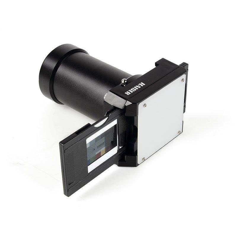 Solução especialista para migração analógico-digital. Elimine incertezas do uso de scanners lentos com este kit direto: basta montar o duplicador na lente, inserir o slide e fotografar. Compatível com sensores grandes (com ajuste de foco) e permite total controlo manual da iluminação e da exposição segundo a exigência profissional.