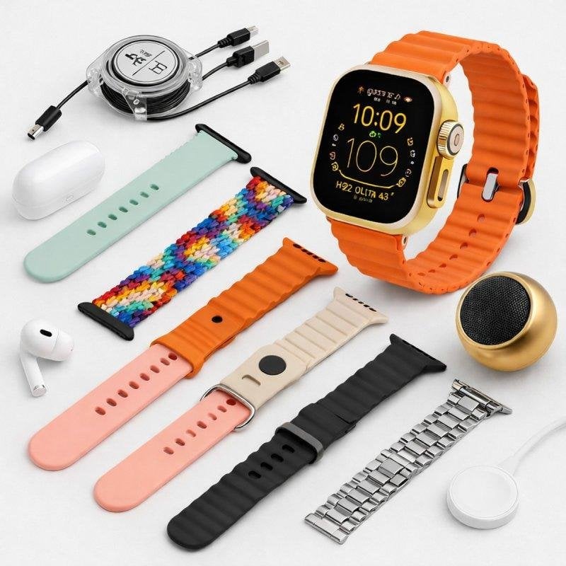 Personalize o seu estilo com as 7 braceletes intercambiáveis incluídas, adequadas para todas as ocasiões. Este pack completo inclui também auriculares Bluetooth sem fios e uma coluna portátil, permitindo-lhe desfrutar de música e chamadas com liberdade total.