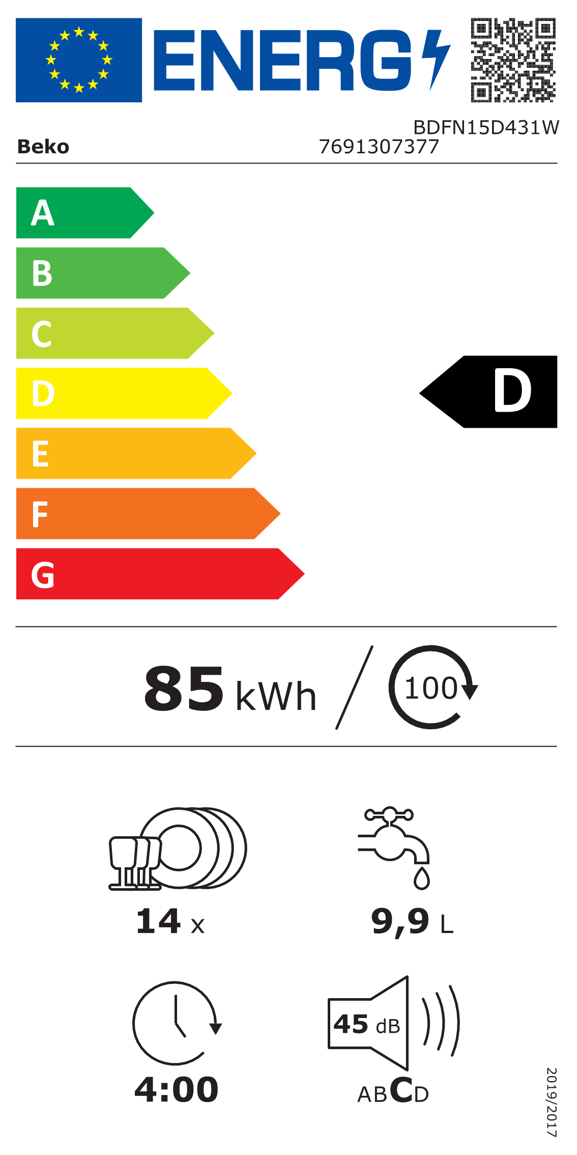 Lavavajillas Beko BDFN15D431W 14 Talheres Classe D SelfDry SaveWater