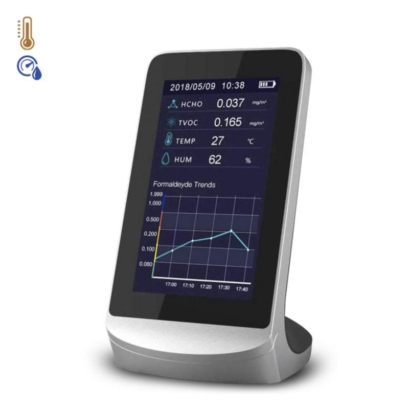 Monitorização ambiental avançada. Concebido para profissionais que procuram dados ambientais interiores fiáveis, este monitor integra sensores de última geração para detetar formaldeído ( HCHO ), compostos orgânicos voláteis totais ( COVT ) e partículas finas respiráveis ( PM2,5 , PM1,0 , PM10 ). Oferece leituras em tempo real graças a um sistema de laser preciso e ventilador integrado, permitindo ajustes imediatos na qualidade ambiental.