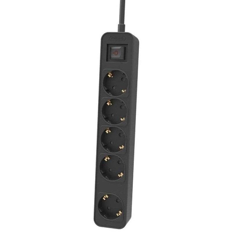 É compatível com plugues padrão europeu (Schuko)? Sim, as 5 tomadas são do tipo Schuko com ligação à terra, garantindo compatibilidade com a maioria dos equipamentos europeus.