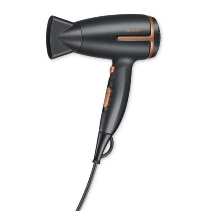 Portabilidade e ergonomia. O mango dobrável facilita o transporte e armazenamento, sendo perfeito para viagens ou uso profissional. Design leve, com acabamentos em preto e rosé de toque sofisticado e moderno.