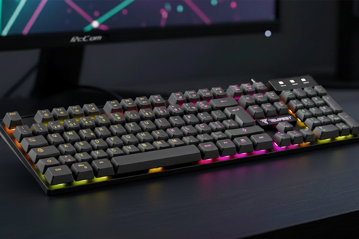 Teclado de membrana com 104 teclas, 19 anti-ghosting e retroiluminação arco-íris, oferecendo durabilidade, precisão e visibilidade a todo o momento