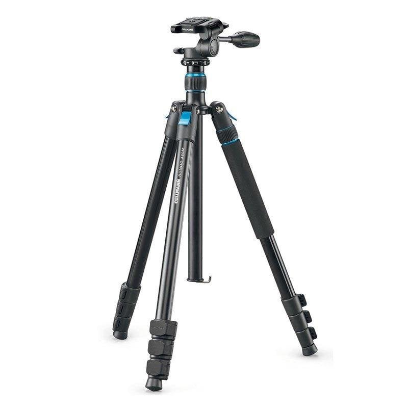 Inclui uma cabeça triaxial (3 vias) em alumínio, ideal para movimentos panorâmicos precisos, ajustes verticais e horizontais para fotografia macro ou vídeo.