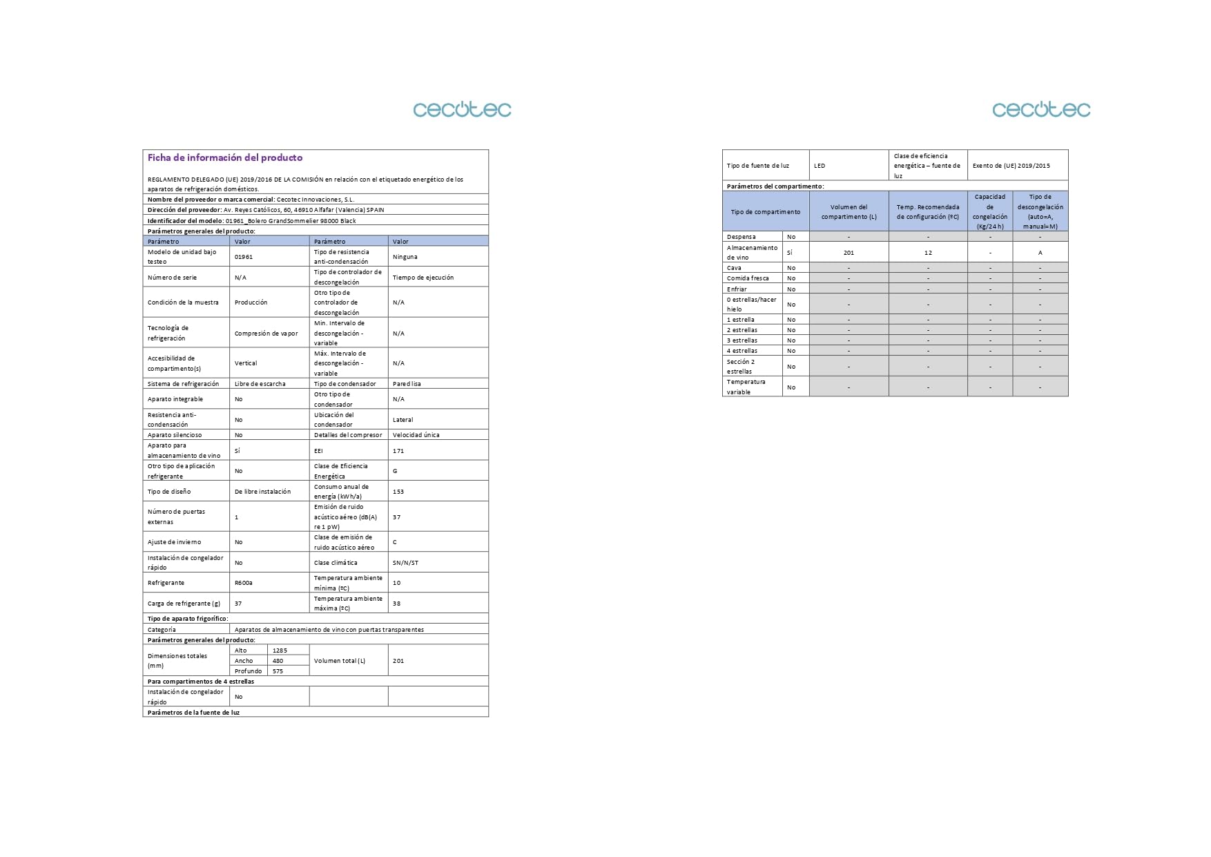Especificações Vinoteca Cecotec Grand Sommelier 201L