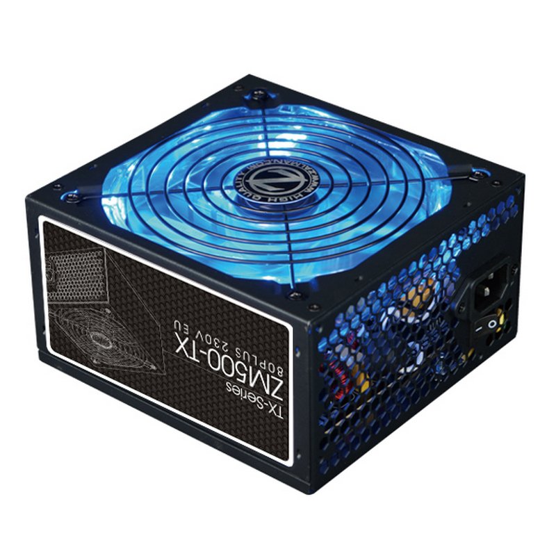 Fonte de alimentação Zalman ZM500-TX 500W, com circuito PFC ativo para alta eficiência e circuito conversor com avanço duplo para estabilidade. Incorpora uma silenciosa ventoinha de 1400 mm com iluminação LED azul.